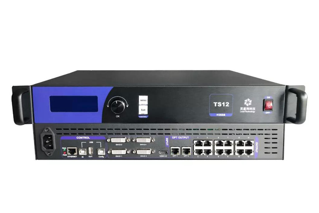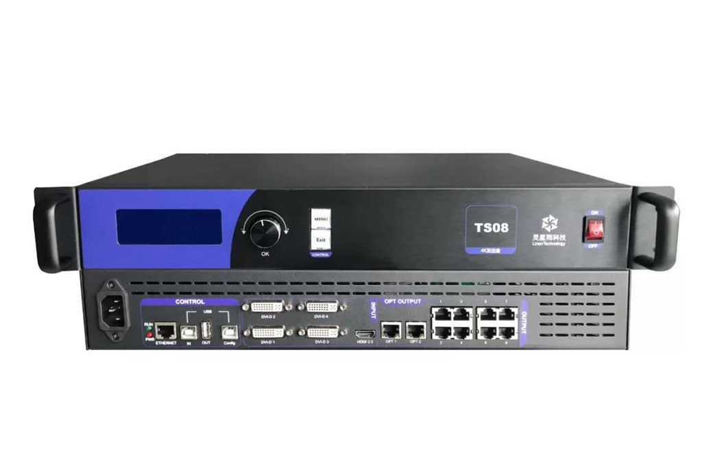 TS08 TS12 TS16 is a large transmission box for the Star Rain 8~16 network port. It supports monochrome, two-color, full-color display. The maximum load supports 2.6 million pixels. An external brightness sensor can be used to automatically adjust the brightness, which can be controlled in multiple stages.