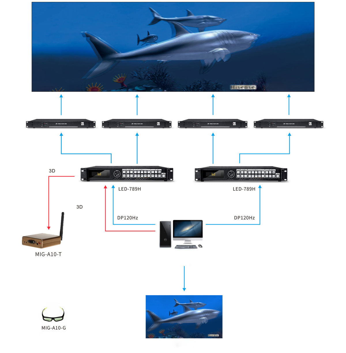 LED-789H/789H Pro is specially designed to solve the problem of 3D signal synchronization, the original 3D sync module, connects the 3D sync signal from the graphics card to the processor, the processor outputs to the 3D emitter, and adjusts the parameters of 3D Sync to solve the problem caused by the delay, ensuring that the user's left and right eyes can see the corresponding LED screen at the correct time.
